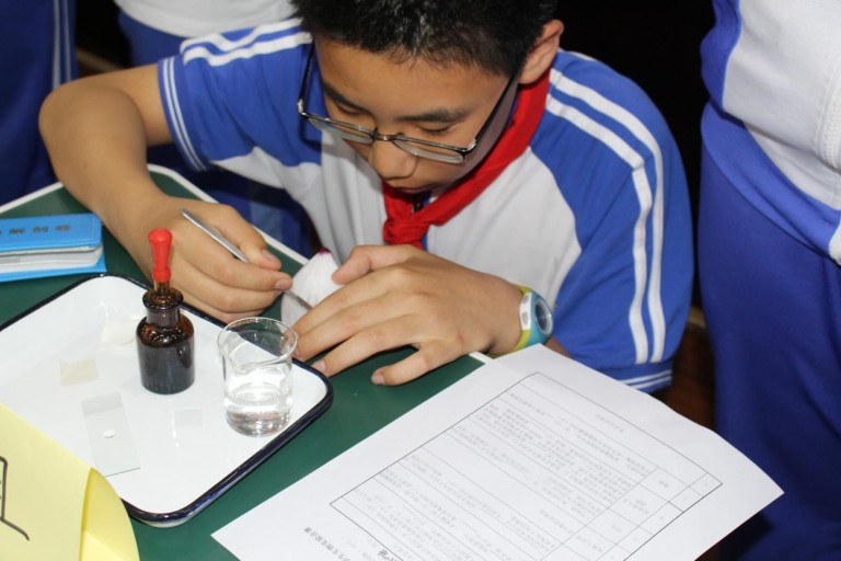 接着在老师指导下,青少年们化身“小小科学家”,动手制作装片:用吸管吸取纯净水放在载玻片上,随后用镊子小心地夹取洋葱内表皮,放在水滴内,盖上盖玻片,从一侧进行染色,组成临时装片。